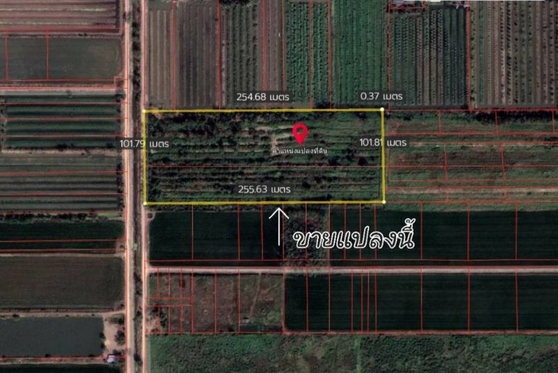 หน้ากว้างติดถนนเกือบ 100 เมตร ยาว 255 เมตร เหมาะทำโครงการเกษตร ตอนเกษียณอายุ หรือโครงการจัดสรรแบ่งขายเป็นแปลงเล็ก ติดคลองส่งน้ำ ด้านหน้า-ด้านข้างของแปลงที่ดิน