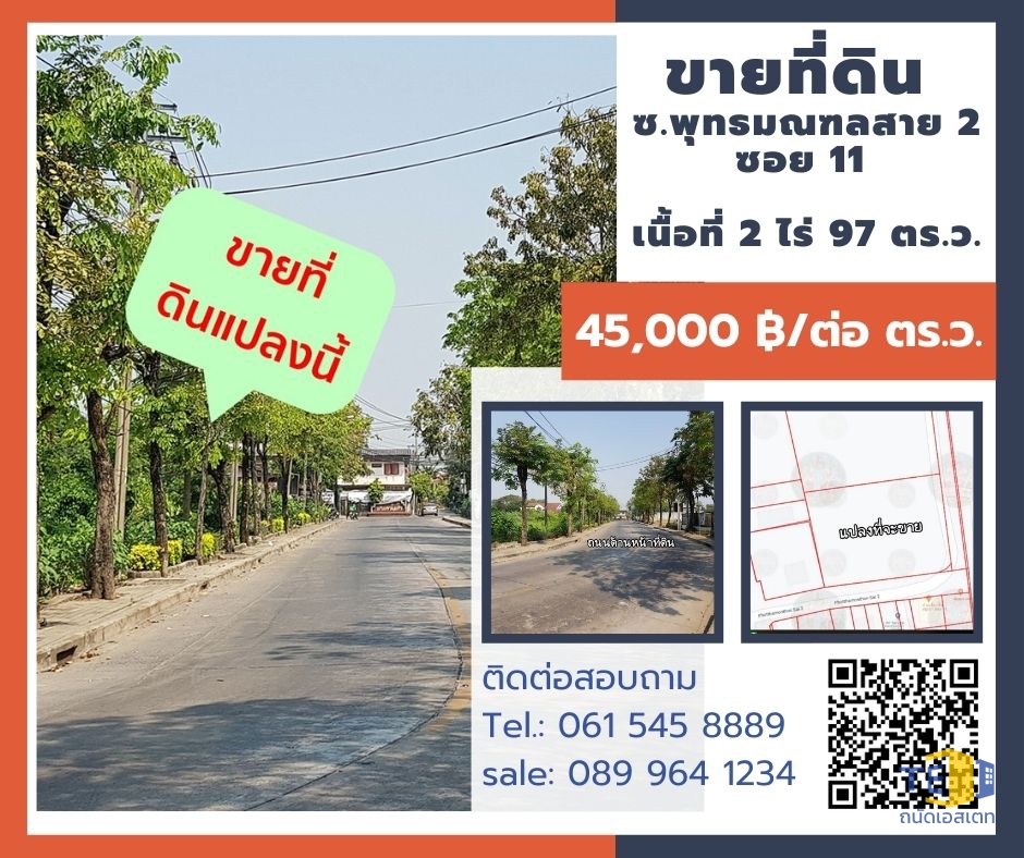 ที่ดินขายที่ดินเปล่า ซอยพุทธมณฑล สาย 2 ซอย 11 เนื้อที่ 2 ไร่ 97 ตารางวา ติดถนน 2 ด้าน หน้ากว้างติดถนนประมาณ 120 เมตร ที่สวยเหมาะทำร้านอาหาร หรือโชว์หน้าร้าน ทำออฟฟิต หรือที่อยู่อาศัย ทำเลดีมาก ตรงข้ามกับสนามฟุตบอลแกรนบัลลงค์ดอร์