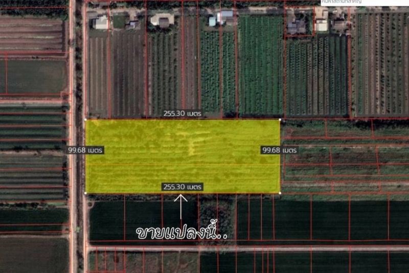 หน้ากว้างติดถนนเกือบ 100 เมตร ยาว 255 เมตร เหมาะทำโครงการเกษตร ตอนเกษียณอายุ หรือโครงการจัดสรรแบ่งขายเป็นแปลงเล็ก ติดคลองส่งน้ำ ด้านหน้า-ด้านข้างของแปลงที่ดิน